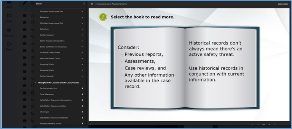 Navigate through the training as usual. When you reach the Historical Information Slide, ensure that you let all audio play through before clicking the book. Additional audio will play, and the Next button should activate upon completion.