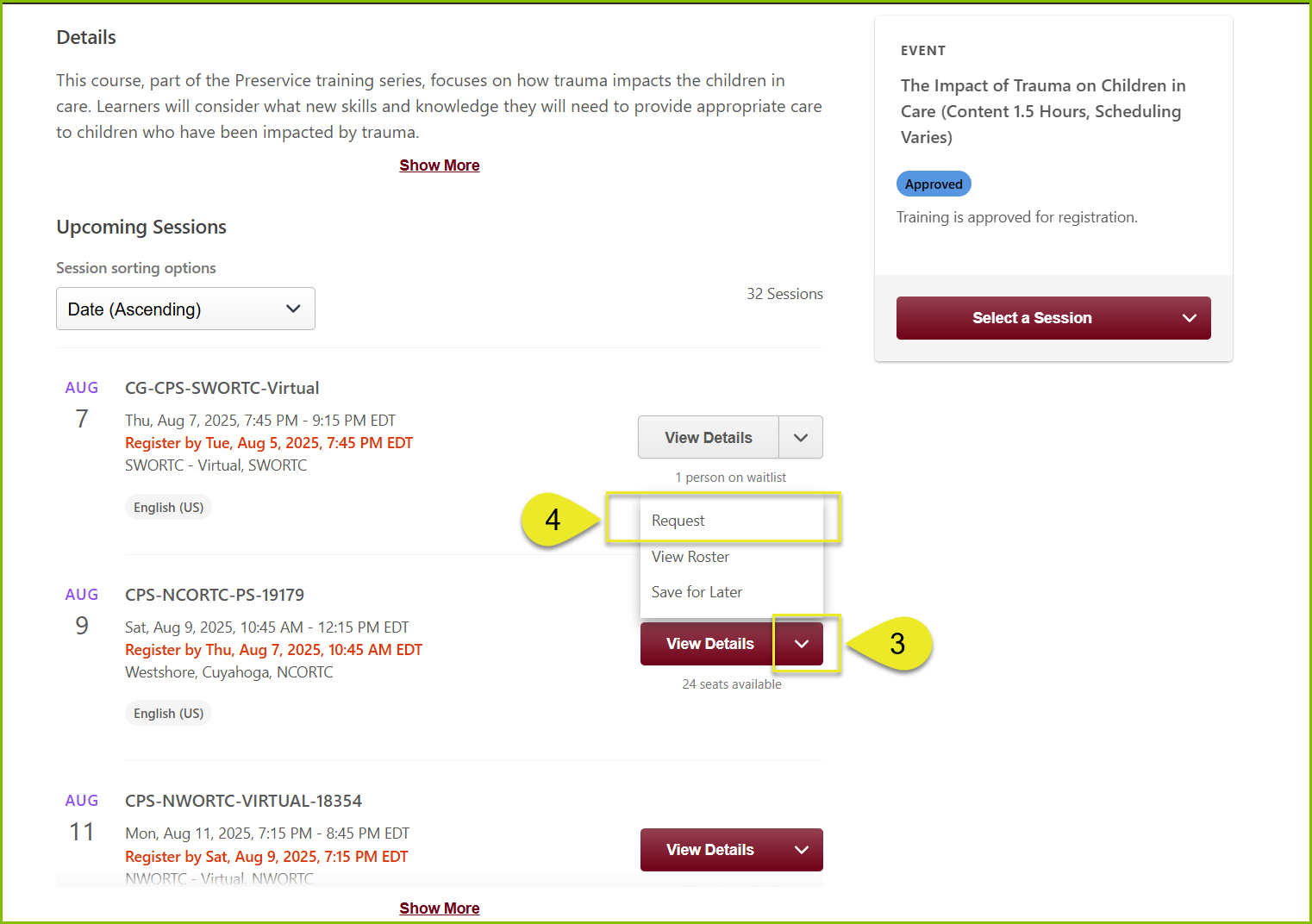 Kindly note that if you are still registered or waitlisted for another session of the training you are trying to reschedule, you will be unable to select a new session. To resolve this, you will have to be listed as “Withdrawn” from the session you are currently enrolled in.