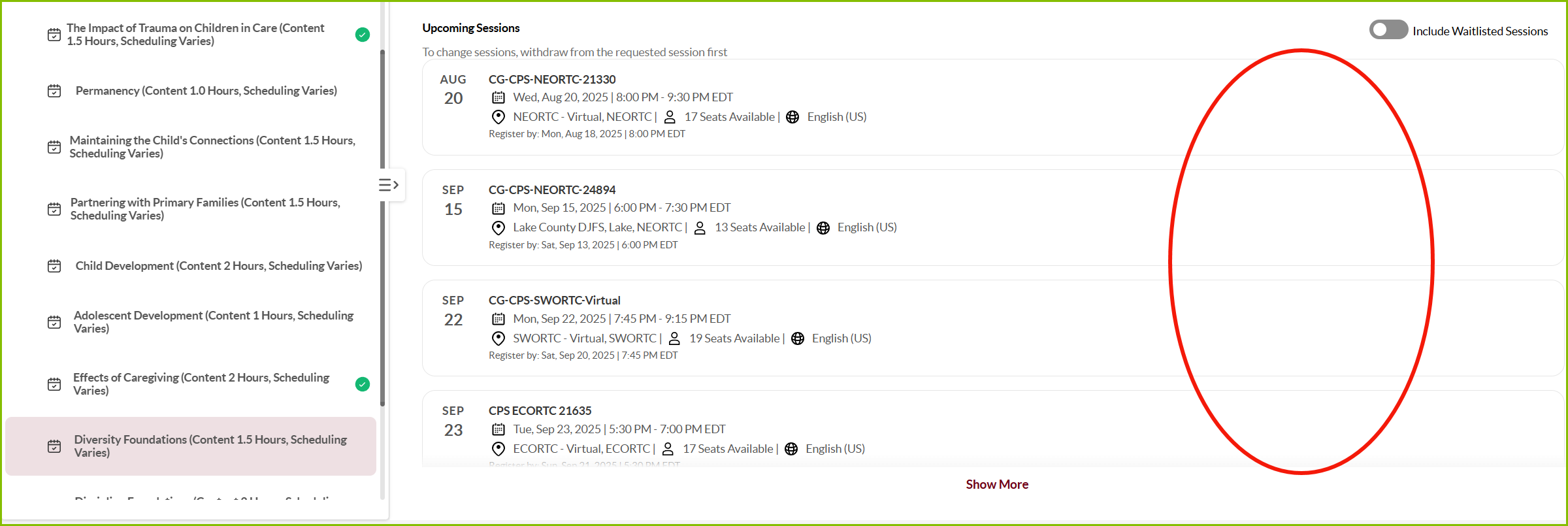 A workaround to this is to have users select a session from the “View Details” page of the course.