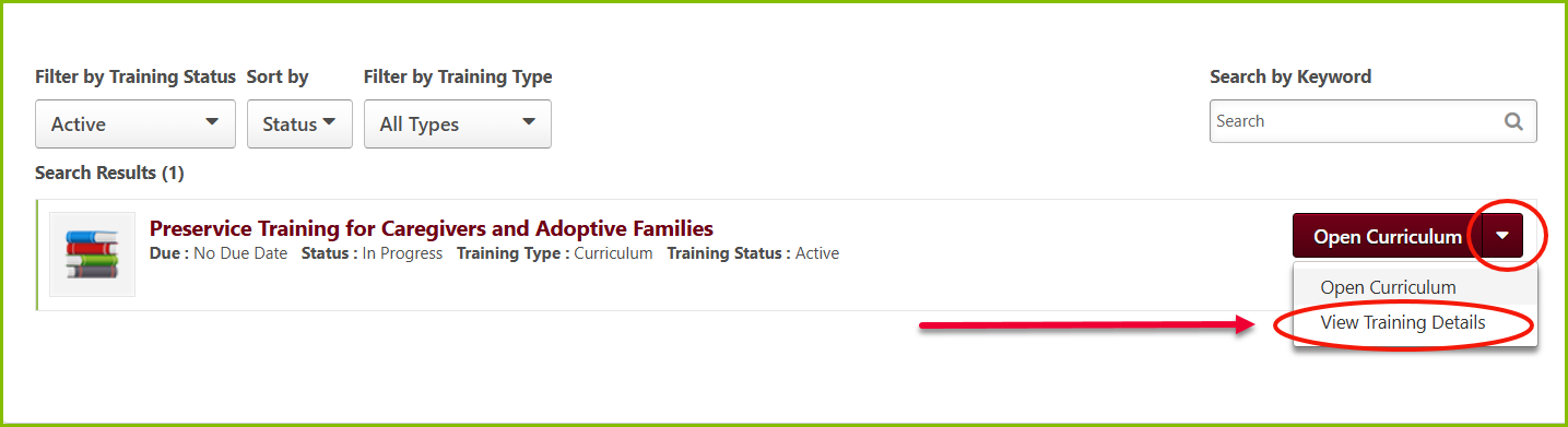 1. Next to the curricula title, click on the downward arrow (▼) to the right of the Open Curriculum button.